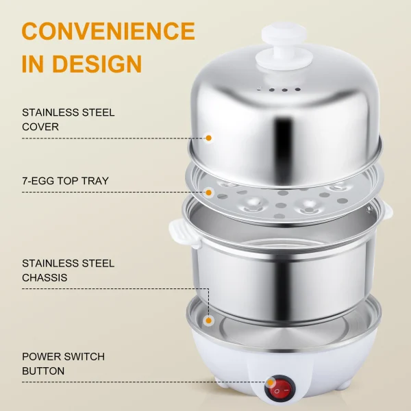 The multi-functional design allows you to prepare hard-boiled eggs, fluffy scrambled eggs, poached eggs, or omelets with ease. Simply add water, load your eggs, and let the cooker do the rest. The auto shut-off feature ensures safe, worry-free cooking, so you can focus on other tasks while your eggs are perfectly prepared.