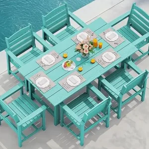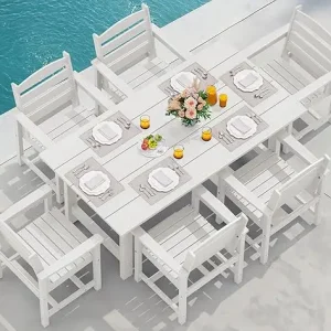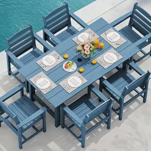 Create the ultimate outdoor dining space with this 7-piece patio dining set, complete with an extended table and six ergonomic chairs. Built with all-weather HDPE material, the set is designed to withstand sun, rain, and changing seasons while maintaining its stylish wood-textured finish.