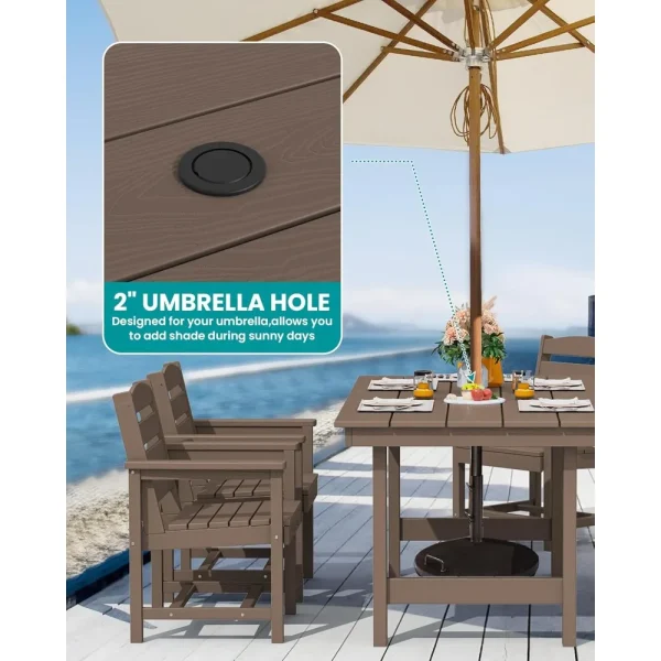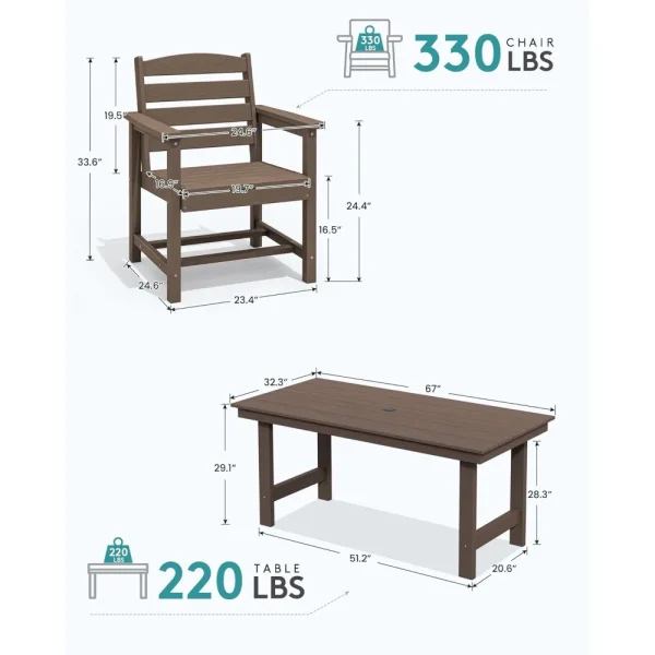 The spacious 66.9” x 32.2” dining table features a convenient umbrella hole cut-out, giving you the option to add shade on sunny days. Its sturdy design supports up to 220 lbs, making it ideal for family meals, drinks, and outdoor décor. Each chair is crafted with armrests and slatted seats for comfort and durability, supporting up to 330 lbs per seat.