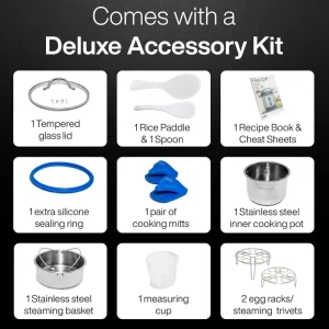 What sets it apart? The Deluxe Accessory Kit included: a tempered glass lid for slow cooking, two egg racks/steaming trivets, stainless steel steaming basket, stainless steel inner pot, extra silicone sealing ring, ladle, rice paddle, cooking mitts, and a measuring cup—everything you need to get started.